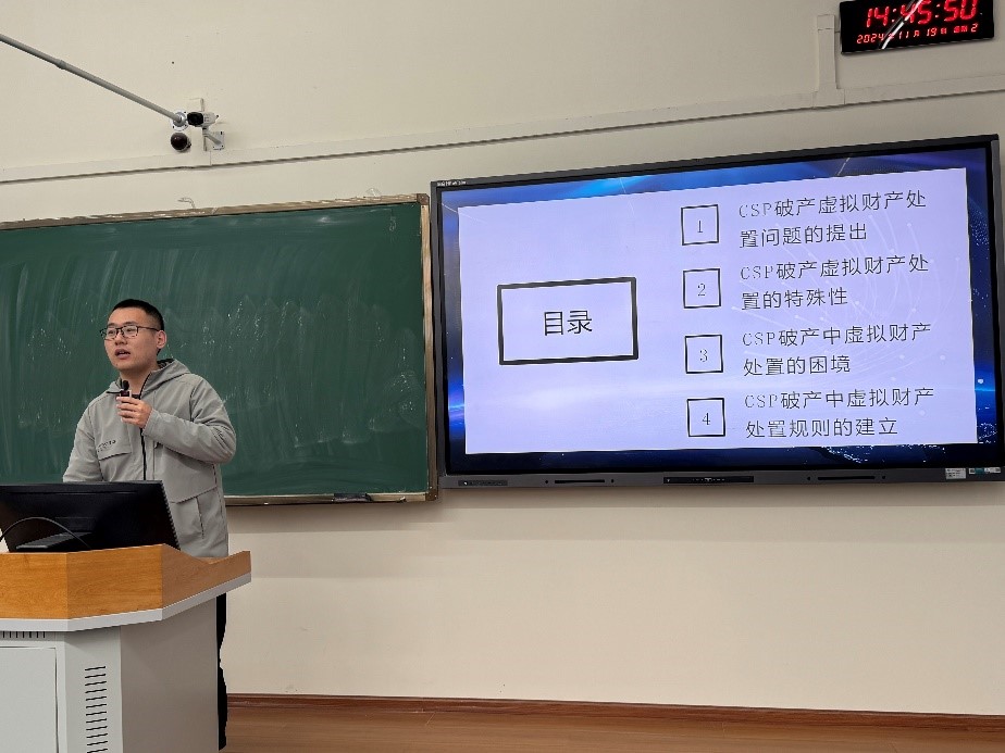 法學(xué)院陳漢同學(xué)的報(bào)告《當(dāng)技術(shù)比法律更快時(shí):CSP破產(chǎn)虛擬財(cái)產(chǎn)處置規(guī)則》聚焦于技術(shù)快速發(fā)展帶來(lái)的法律挑戰(zhàn)。他以CSP破產(chǎn)虛擬財(cái)產(chǎn)處置為核心,系統(tǒng)分析了這一問(wèn)題的特殊性與現(xiàn)存法律框架的困境,并通過(guò)剖析典型案例與數(shù)據(jù)建模,他提出應(yīng)該建立具有前瞻性的CSP破產(chǎn)虛擬財(cái)產(chǎn)處置規(guī)則,為虛擬財(cái)產(chǎn)權(quán)益保護(hù)提供了理論依據(jù)和實(shí)踐參考。