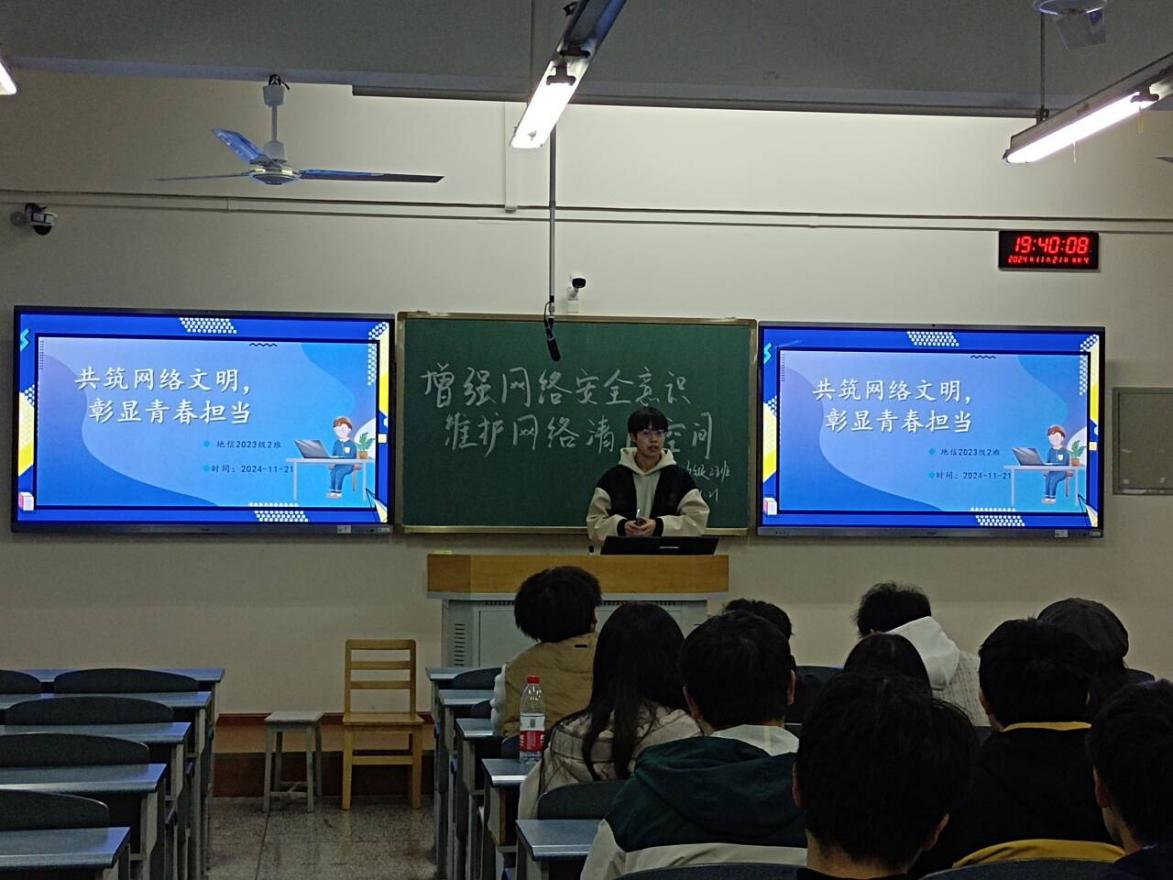 網絡文明是社會主義精神文明的重要內容,是網絡強國建設的重要領域,是中華民族現代文明的重要組成部分。習近平總書記高度重視網絡文明建設,明確要求“做強網上正面宣傳,培育積極健康、向上向善的網絡文化,用社會主義核心價值觀和人類優秀文明成果滋養人心、滋養社會,做到正能量充沛、主旋律高昂,為廣大網民特別是青少年營造一個風清氣正的網絡空間”,不斷引領和推動網絡生態更加天朗氣清、網絡文化更加繁榮發展、網絡文明更加惠風和暢。2024年11月21日,地理信息科學2023級2班開展以“共筑網絡文明,彰顯青春擔當”為主題的團會活動。在班主任、輔導員的指導下,各班委認真準備,并動員本支部同學積極參與,成功開展此次團會活動。