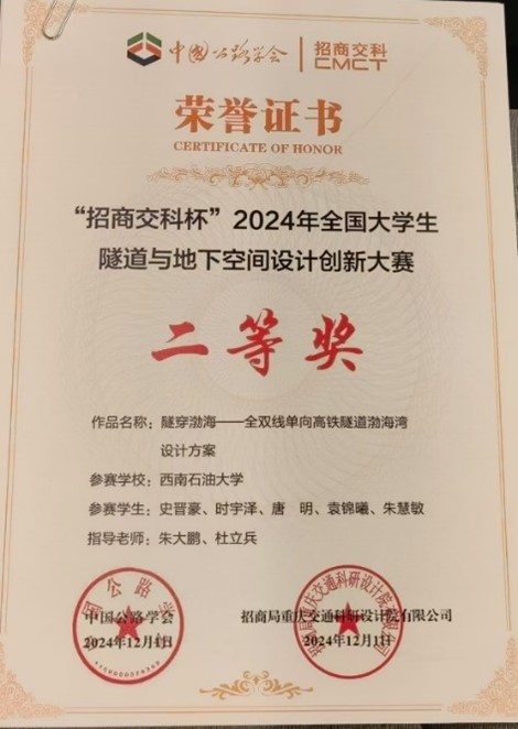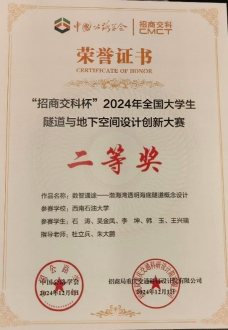 經過層層篩選和專家組嚴格評審,本次大賽共有來自哈爾濱工業大學、東南大學、重慶大學、西南石油大學等高校的26支隊伍123名參賽選手進入決賽,現場展開智慧交鋒,共同探索隧道與地下空間設計的無限可能。我校6支隊伍進入總決賽,憑借出色的設計理念和扎實的專業技能,隧穿渤海隊、數智通途隊榮獲二等獎,海水新能隊、智連渤海隊、速通東北隊、抗震無憂隊榮獲三等獎。地科院巖土與地下工程教研室朱大鵬、杜立兵、趙華濤、劉偉、邵康榮獲“優秀指導老師”。