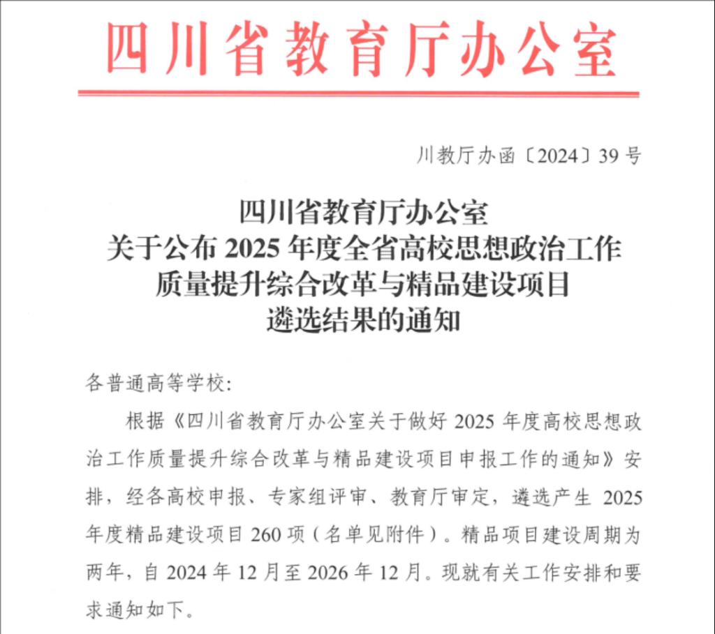 近日,四川省教育廳公布了2025年度全省高校思想政治工作質量提升綜合改革與精品建設項目(以下簡稱“思政項目”)遴選結果,學院申報的3個項目,全部入選,立項數全校第一。學院黨委書記趙曉明牽頭高校原創文化精品《密碼》,院長黃旭日牽頭高校綜合性教育實踐體驗基礎——“地質報國”科普大思政教育實踐體驗基地,學院黨委副書記張勇高校思想政治工作中青年骨干成功獲批。