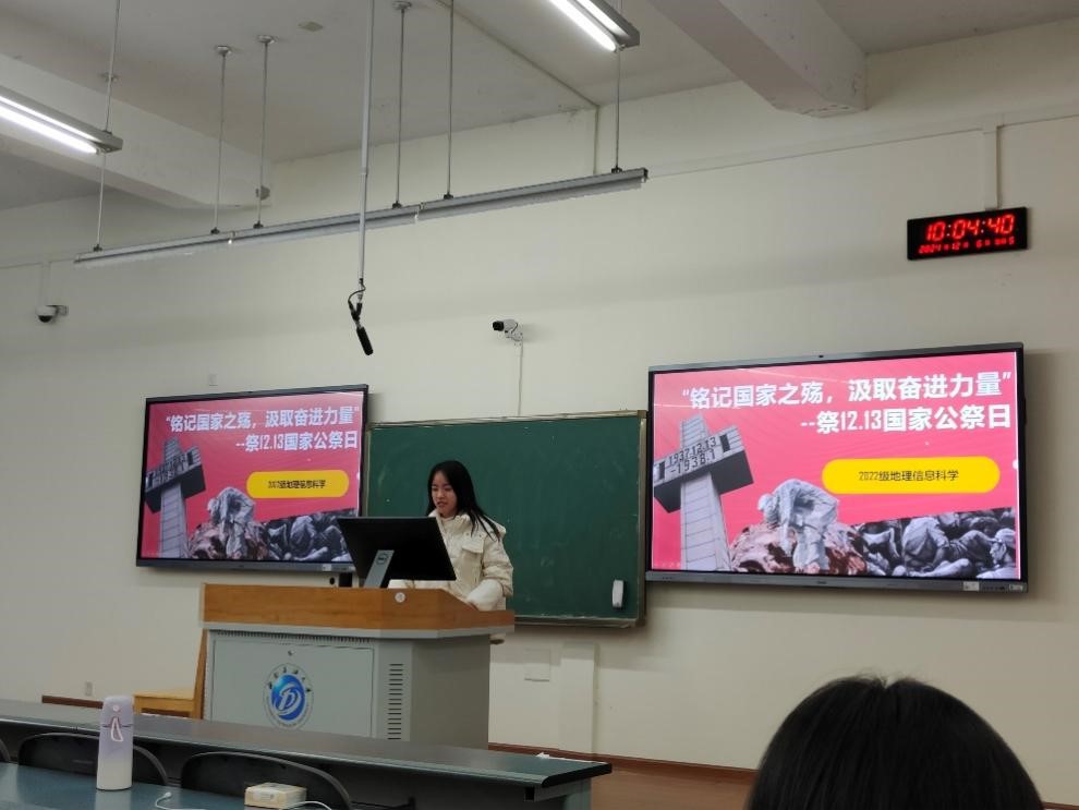 12月13日,西南石油大學地科院 2022 級地理信息科學專業 66 名學生在明辨樓 C204 教室舉行了一場以 “銘記國家之殤,汲取奮進力量” 為主題的國家公祭日主題班會,此次班會由輔導員劉肖主持。