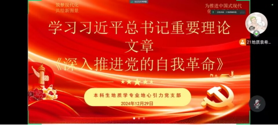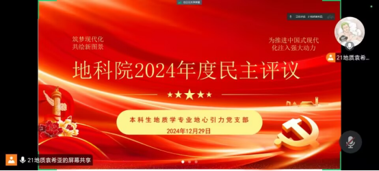 12月29日,本科生地質學專業地心引力黨支部開展地科院2024年度民主評議工作并進行政治學習。黨支部全體成員有序進行了黨員民主測評和黨支部民主測評。測評過程中,要求所選黨員成績優異、先鋒模范作用突出、服務意識強。