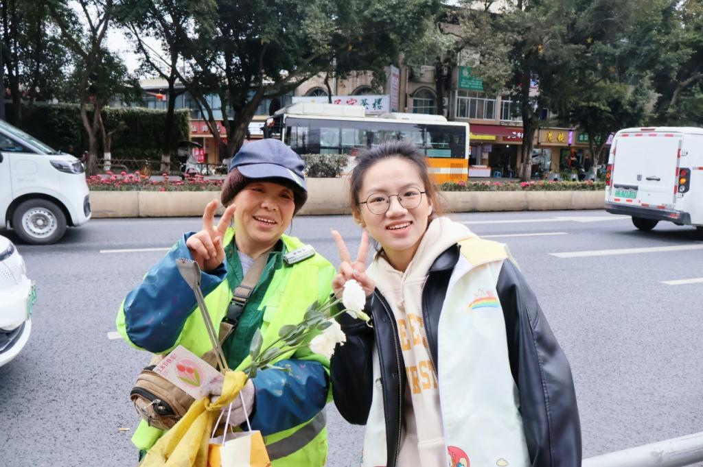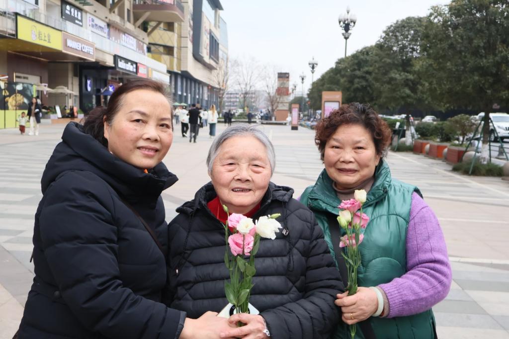 活動中,志愿者們手捧鮮花,面帶微笑,穿梭在七一廣場及附近居民區,將一朵朵寓意著尊重與關愛的小紅花送到女性同胞的手中。每一朵花都承載著對女性辛勤付出和無私奉獻的敬意,以及對她們在家庭、社會中所發揮重要作用的認可。
