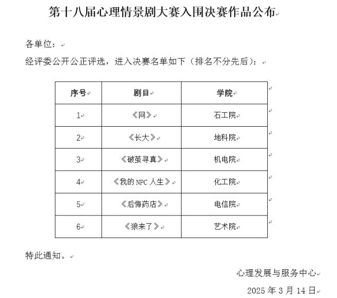 為為引導(dǎo)大學(xué)生積極關(guān)注自我、悅納自我,提升大學(xué)生心理健康素養(yǎng),塑造健康向上的校園心理文化氛圍。3月13日下午,西南石油大學(xué)第十八屆“懷希望前行,筑心靈晴空”心理情景劇大賽初賽于心理發(fā)展與服務(wù)中心團(tuán)輔教室112舉行。經(jīng)過近兩個(gè)月的精心籌備,來自各學(xué)院的14部作品同臺(tái)競(jìng)技,以多元視角探討心理健康議題。其中,我院原創(chuàng)作品《長(zhǎng)大》憑借對(duì)“情緒羞恥”的深刻剖析和細(xì)膩刻畫,成功晉級(jí)決賽。