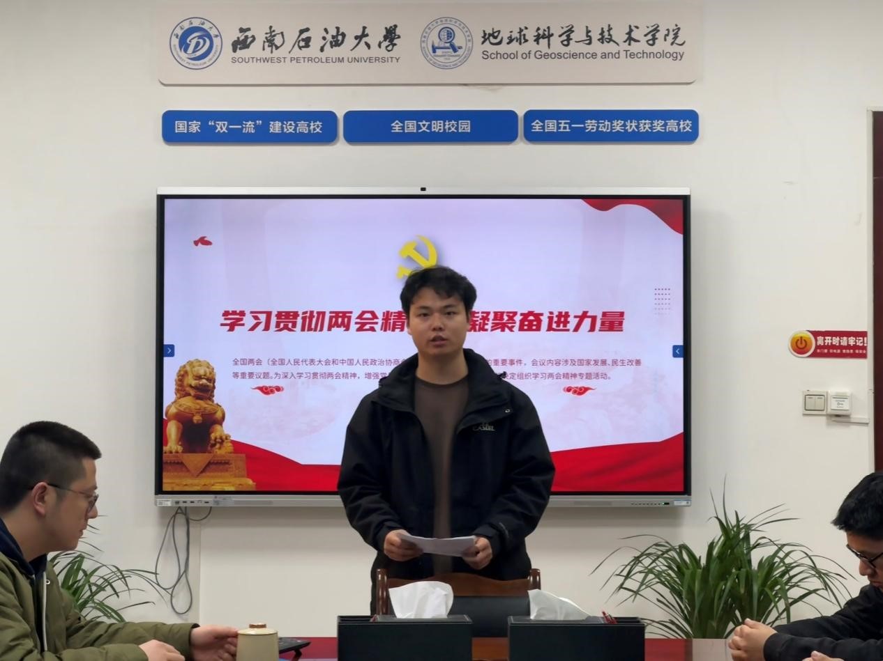 全國兩會(全國人民代表大會和中國人民政治協商會議)是我國政治生活中的重要事件,會議內容涉及國家發展、民生改善等重要議題。為深入學習貫徹兩會精神,增強黨員的政治意識和大局觀念,3月20日下午,地科院本科生勘查技術與工程尋油尖兵黨支部在明辨樓A302會議室組織學習兩會精神專題活動。此次活動由支部書記黃爽老師主持,支部全體黨員參加。