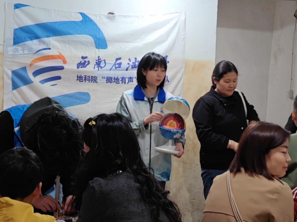 隨著主持人熱情洋溢的開場白,活動正式拉開帷幕。首先映入眼簾的是第一場活動——“地心探險家”。孩子們好奇地圍坐在由西南石油大學(xué)志愿者們精心布置的“地球模型”周圍,這個模型不僅形象地展示了地球的內(nèi)部結(jié)構(gòu),還巧妙地融入了地質(zhì)勘探的元素,讓孩子們仿佛置身于真實的科考現(xiàn)場。志愿者同學(xué)用生動有趣的語言,將復(fù)雜的地球科學(xué)知識轉(zhuǎn)化為孩子們易于理解的內(nèi)容,引導(dǎo)他們探索地球的奧秘。從地殼的堅硬到地幔的熾熱,再到地核的神秘,每一個細節(jié)都讓孩子們聽得津津有味,目不轉(zhuǎn)睛。
