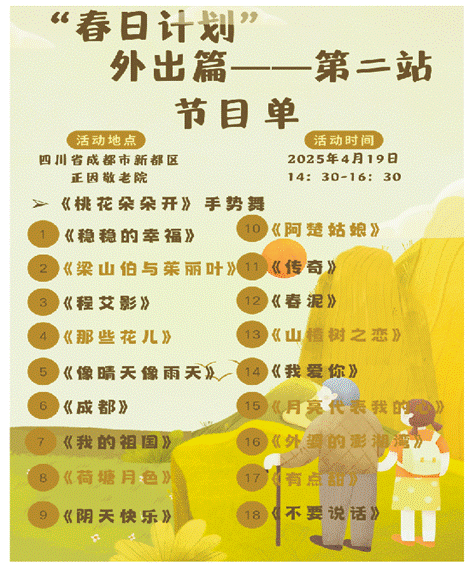 為弘揚尊老敬老的傳統(tǒng)美德,用音樂傳遞溫暖與關愛,2025年4月19日14:30 - 16:30,“春日計劃”團隊來到四川省成都市新都區(qū)正因敬老院,開啟外出篇第二站志愿活動,為老人們帶來了一場精彩紛呈的演出。
