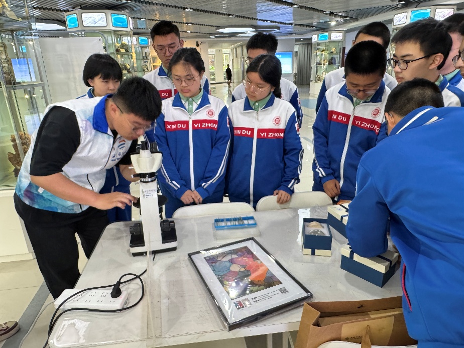 新都一中的同學在地科院志愿者的引導下步入地質展廳。展廳內陳列著巖石、礦物及化石標本,每一件展品都承載著地球億萬年演化的印記。王哲同學以“巖石的故事”為主題,用通俗易懂的語言講述了巖石形成過程及其背后的科學趣聞。他結合實物標本,將復雜的地質知識轉化為趣味橫生的故事,引得同學們頻頻提問,現場氣氛熱烈。