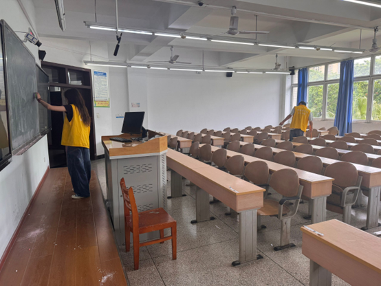 志愿者前往思學(xué)樓,對教學(xué)樓的教室、走廊、樓梯等區(qū)域進(jìn)行全面清掃。他們有的仔細(xì)擦拭黑板、講臺和桌椅,有的認(rèn)真清掃地面垃圾,有的專注清理窗臺灰塵。在清掃過程中,志愿者們還對教室的物品進(jìn)行了整理擺放,讓每一間教室都變得整潔有序。面對一些頑固污漬,志愿者們更是耐心細(xì)致地反復(fù)清理,不放過任何一個細(xì)節(jié)。他們的辛勤付出,讓原本略顯雜亂的教學(xué)樓變得干凈明亮,為師生們營造了更加舒適的學(xué)習(xí)和教學(xué)環(huán)境。