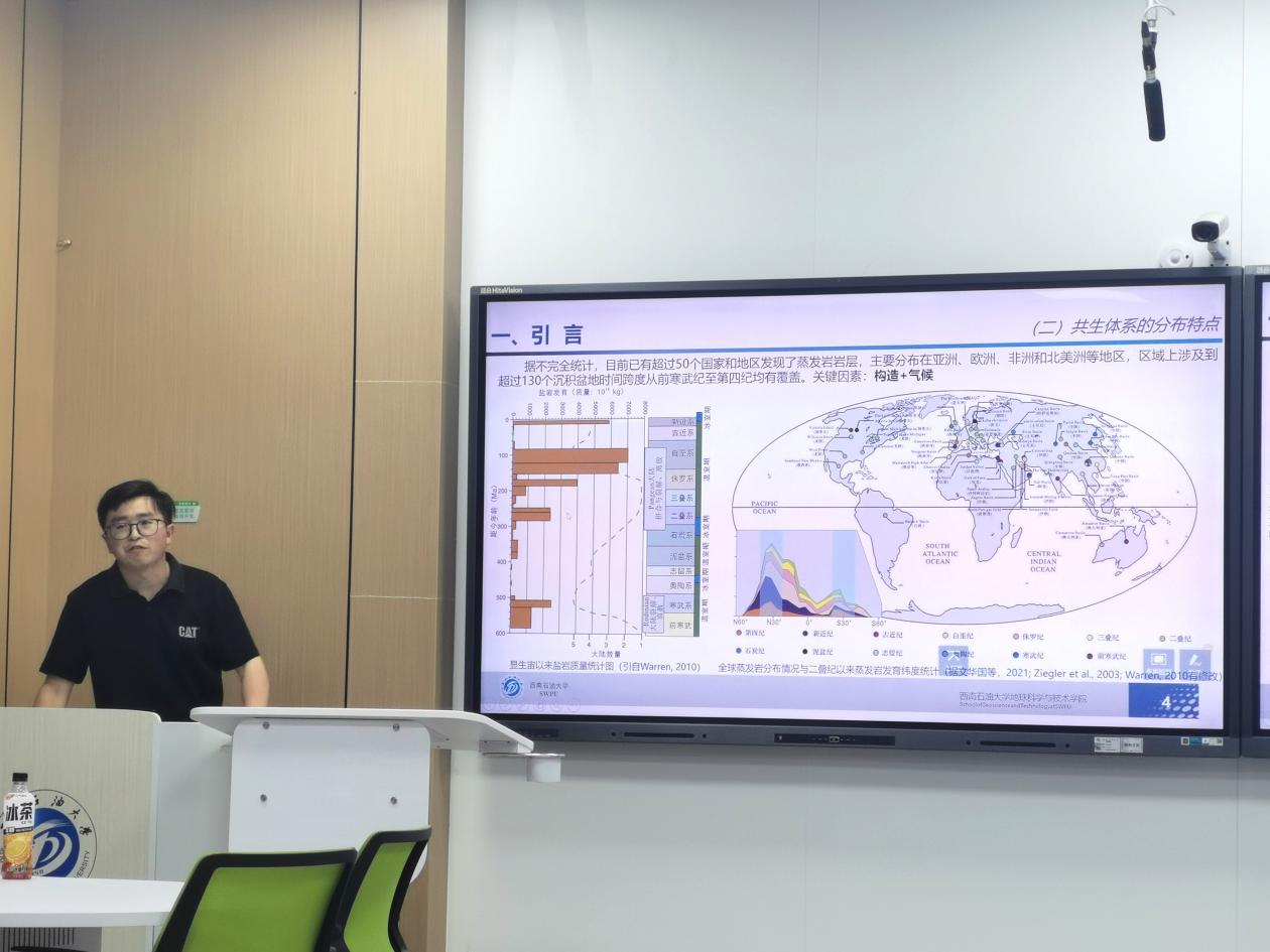 鐘壽康博士表示,碳酸鹽巖與蒸發(fā)巖共生體系因?yàn)槌梢虻亩嘟庑裕蔀榱说刭|(zhì)學(xué)中的研究熱點(diǎn)。廣泛發(fā)育的共生體系,是盆地沉積、構(gòu)造演化以及古海水地球化學(xué)性質(zhì)演化等方面的重要信息載體。報(bào)告首先從碳酸鹽巖與蒸發(fā)巖共生體系成因、研究歷史、分布特點(diǎn)等方面引入話題,重點(diǎn)介紹了共生體系在古海洋性質(zhì)重建、臺(tái)地演化及油氣地質(zhì)等領(lǐng)域的價(jià)值,最后介紹了攻讀博士期間以來關(guān)于碳酸鹽巖與蒸發(fā)巖共生體系的相關(guān)研究經(jīng)歷與創(chuàng)新性成果。報(bào)告全方位展示了碳酸鹽巖與蒸發(fā)巖共生體系的研究淵源、熱點(diǎn)領(lǐng)域及理論應(yīng)用,并引發(fā)在場(chǎng)師生的熱烈討論。
