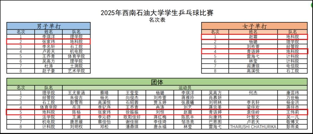 地科院在2025年西南石油大學學生乒乓球比賽中斬獲佳績
