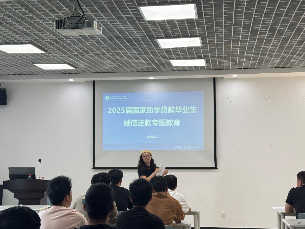 為進一步加強畢業生助學貸款誠信教育,增強學生誠信還款意識,構建誠信校園文化,地球科學與技術學院于5月19日在明辨樓D404開展了2025屆國家助學金貸款本科畢業生誠信還款專題教育。本次活動由2021級輔導員劉楊潔雅、黃爽主持,全體申請助學貸款的畢業生參與其中。