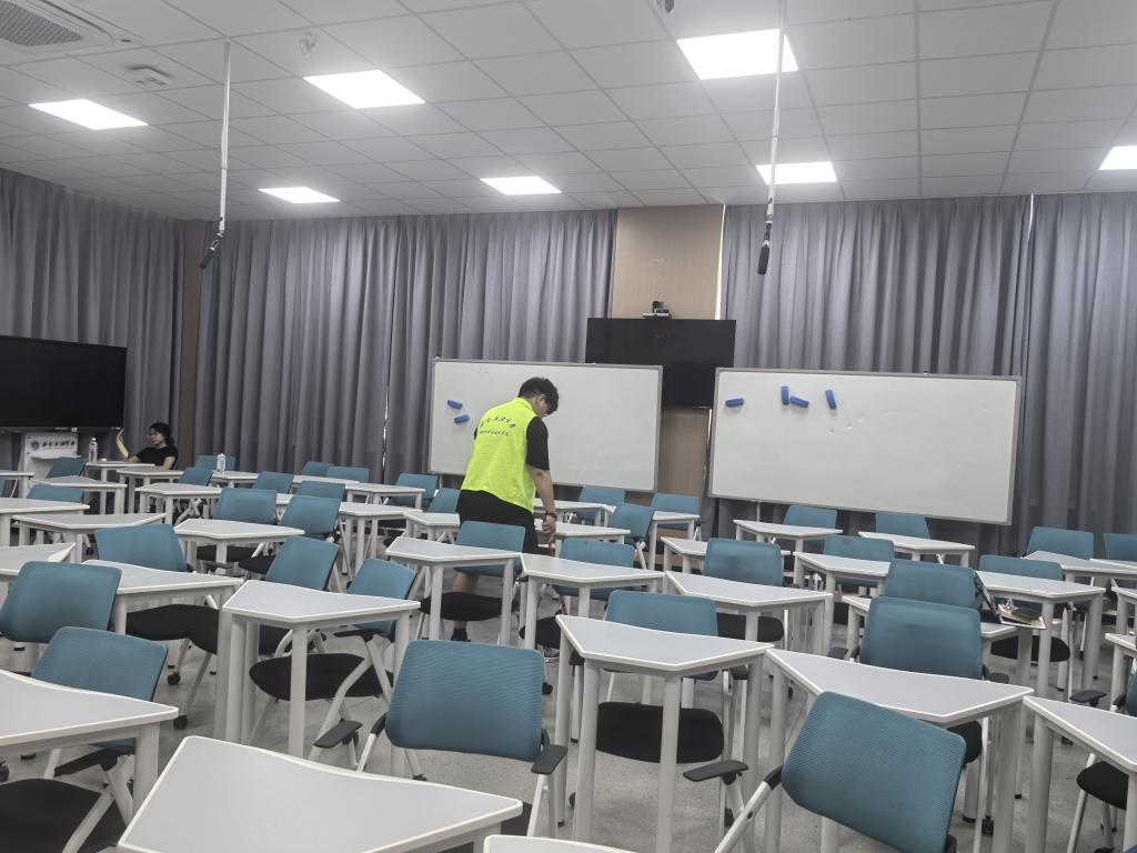 活動當日,志愿者們早早集合,攜帶掃帚、抹布、拖把等清潔工具來到思學樓。在明確分工后,同學們迅速投入到緊張而有序的清掃工作中。一部分志愿者負責教室的清掃,他們認真擦拭黑板、講臺,清理課桌椅上的污漬,仔細清掃地面的灰塵和垃圾,確保每一間教室都窗明幾凈。另一部分志愿者則專注于公共區域,如走廊、樓梯、衛生間等的清潔。他們不放過任何一個衛生死角,擦拭扶手、清理墻壁上的小廣告、清掃樓梯間的雜物,使公共區域煥然一新。