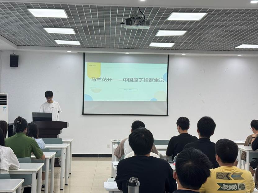 周峙岐同志分享了《馬蘭花開:中國原子彈誕生記》的閱讀體會。他動情講述了老一輩科學家在戈壁灘上艱苦奮斗的感人故事,重點解讀了“兩彈一星”精神的內涵。