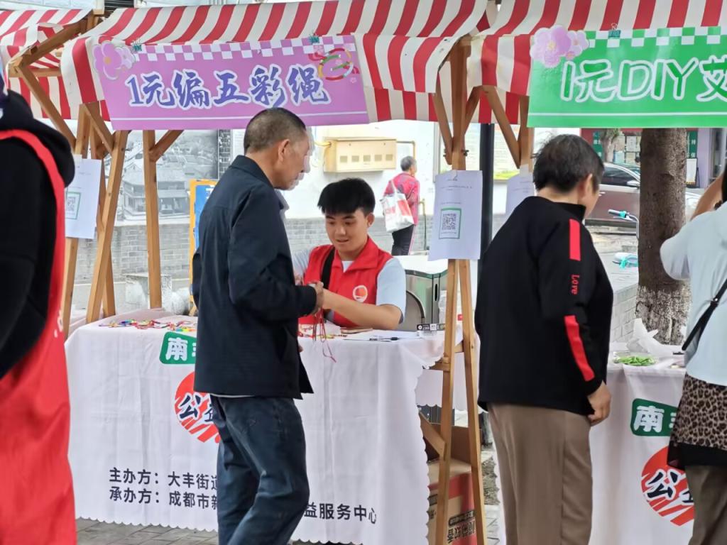 社區廣場上,以"端午安康" 為主題的義賣集市同步開市。手工編織的五彩手繩、艾草香囊、新鮮艾草束及現包粽子整齊陳列,吸引眾多居民駐足。"端午戴手繩有祈福納祥的寓意,這些手繩都是我們和社區阿姨一起編的。"