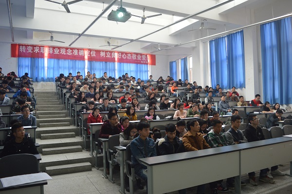 在大會上,肖友平首先向與會大學畢業生分析了當前社會形勢下大學生的就業形勢及職場現狀,多方面闡述了當前就業形勢的嚴峻。他介紹了最近將會來校招聘及就業中心組織的一些企業的招聘情況,希望同學們有針對性地做好專用應聘書及相關知識準備。他以幽默風趣的言談,以眾多的就業實例告訴同學們,剛出社會找工作需以一種“鍛煉自己,磨練自己”的心態去就業,讓與會的同學感觸頗深。他講到面對當前的就業形勢也不要過分的緊張,現階段需加強專業知識及技能培養,做好人生規劃,樹立正確的就業觀和擇業觀,調整自己的職業理想。基于現狀,他給出幾點建議:一是要把握住為數不多的崗位;二是關注到校相關企業積極應聘;三是挖掘自身優勢尤其是非專業優勢;四是積極搜集關注就業信息主動出擊;五是關注大學生應征入伍及西部志愿和特崗計劃等;六是關注民營企業和私企。