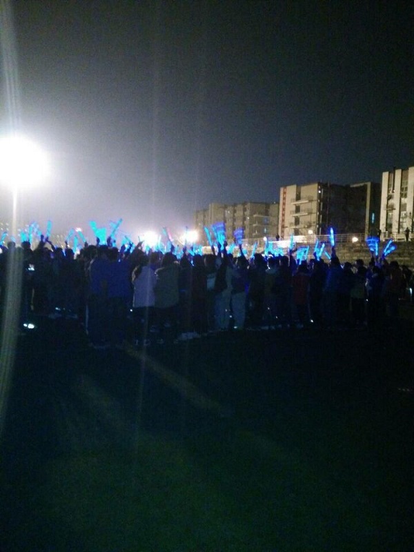 藍色的隊伍不多時就到達了我們的終點----操場上巨大的藍色星星。志愿者站在星星里,揮舞著熒光棒,向天空吶喊著:“西南石油大學祝所有自閉癥兒童早日康復!”
