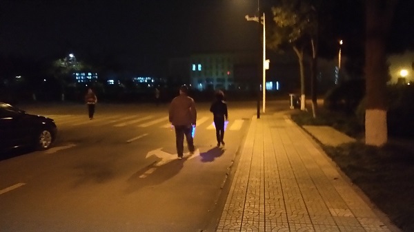 熒光跑的隊伍里還吸引了一對中年夫婦,阿姨接過志愿者們遞過來的藍色熒光棒,興奮的拉著身體明顯發福又不愿意跑的叔叔快速往前跑:“哎呀,你稍微快一點嘛,同學們都要看不見了。”