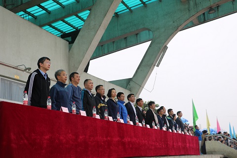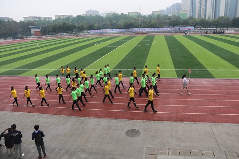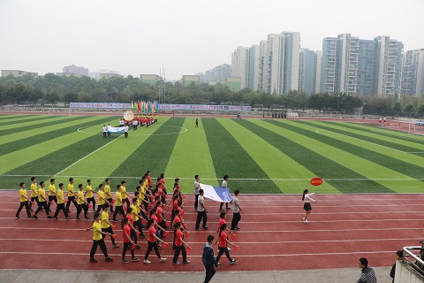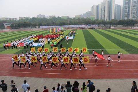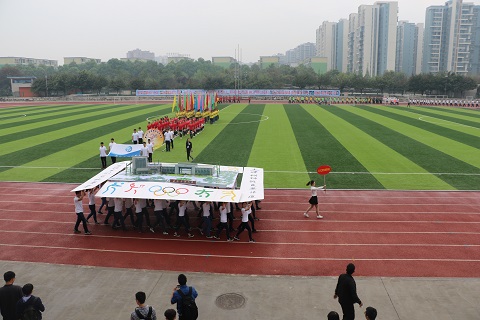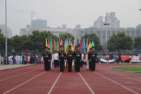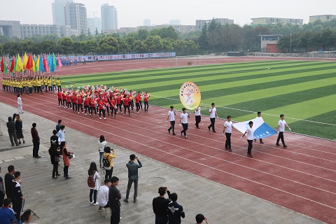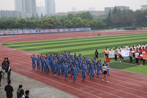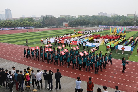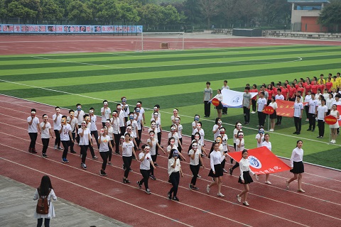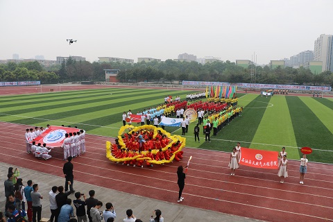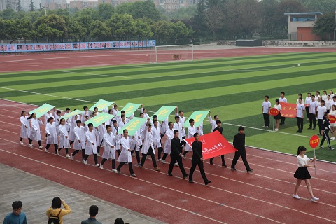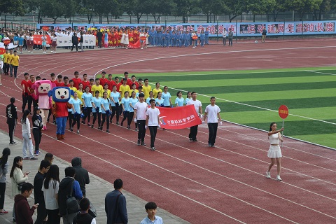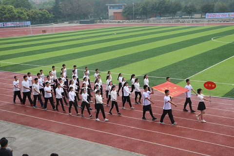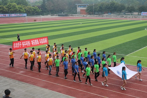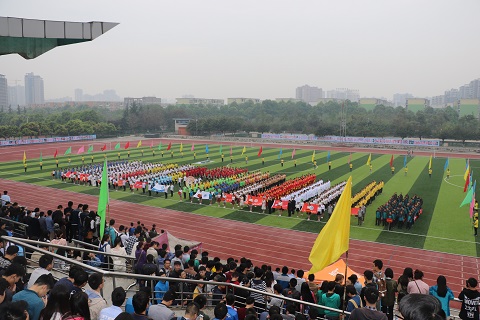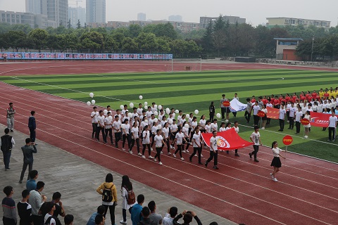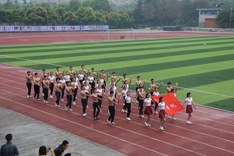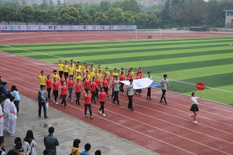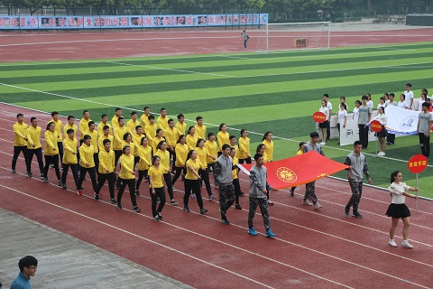 早晨氤氳蒙蒙的空氣輕撫著運動場上所有的觀眾,運動員和老師們,經過充分準備的各院系代表隊早已在紅色跑道上整裝待發。隨著嘹亮激昂的《運動員進行曲》響起,第四十屆春季田徑運動會開幕式拉開了帷幕,首先朝著主席臺走來的是氣貫長虹的國旗護衛隊,他們昂首挺胸,英姿颯爽。緊跟其后的是旗幟飄揚的地科院彩旗先發隊,隨之而來的是各具特色的學院方隊,最后壓軸的方隊為教職工代表隊,伴隨著進行曲的旋律,老師們響亮的喊出口號:“務實創新,協作奉獻,包容擔當,追求卓越!”