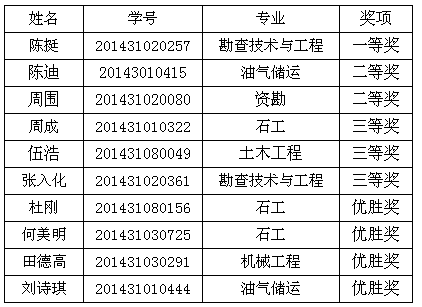 本次知識競賽全校共評出三等獎及以上共6人,地科院獲獎3人,占一半的比例。其中,來自勘查技術與工程2014級的陳挺獲一等獎(全校僅一人),資源勘查工程2014級周圍獲二等獎,勘查技術與工程2014級張入化獲得三等獎。