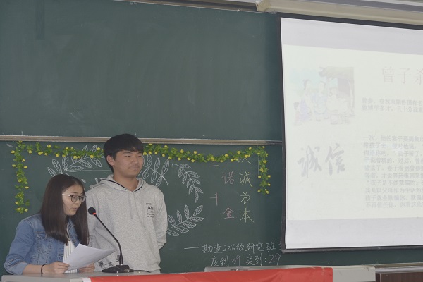 4月20日,地科院2016級各團支部開展以“推進社會信用體系建設,弘揚誠信理念”為主題的團組織生活。同學們認真準備,共同策劃,積極參與,效果良好。