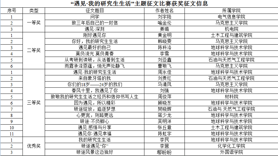 5月5日,由校研究生會和地科院研究生會聯合舉辦的“遇見?我的研究生生活”主題征文比賽圓滿落幕。來自電氣信息學院劉宇陸的《學問》、馬克思主義學院喻金倫的《致三年后自己的一封信》與機電工程學院姜璐的《遇見?深刻》三篇文章榮獲一等獎。?