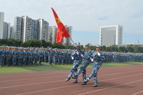 伴隨著《歌唱祖國》氣勢磅礴的旋律,全體起立,迎國旗,奏唱國歌。隨后,閱兵式正式開始。在雄壯昂揚的《檢閱進行曲》中,黨委副書記趙正文及閱兵首長檢閱了各參訓方隊,同學們“為校爭光”的洪亮口號在整個操場回蕩著。伴隨著激昂的《分列式進行曲》,參訓方隊邁著整齊的步伐,依次正步走過主席臺。他們熱情高漲,動作標準,希望通過此次匯報表演向大家展示了為期十二天的軍訓成果,答謝教官的諄諄教導。