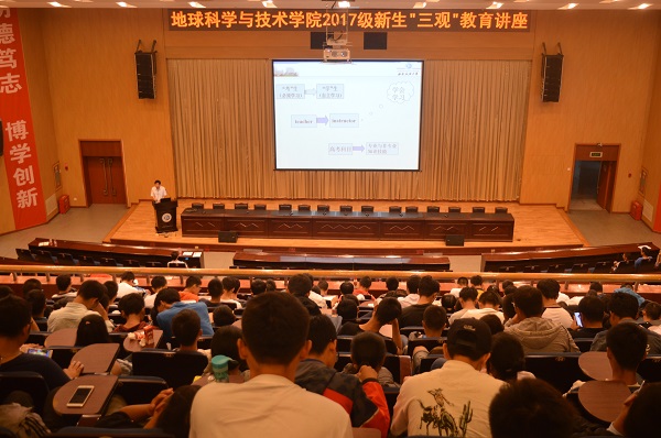 為加強(qiáng)新生的人文素養(yǎng)、幫助新生更好的適應(yīng)大學(xué)生活,樹立奮斗目標(biāo)。9月29日,地科院在圖書館報(bào)告廳舉辦2017級新生“三觀”教育講座。此次講座由李明科老師主持、馬克思主義學(xué)院張小飛院長擔(dān)任主講,地科院全體新生聆聽此次講座。
