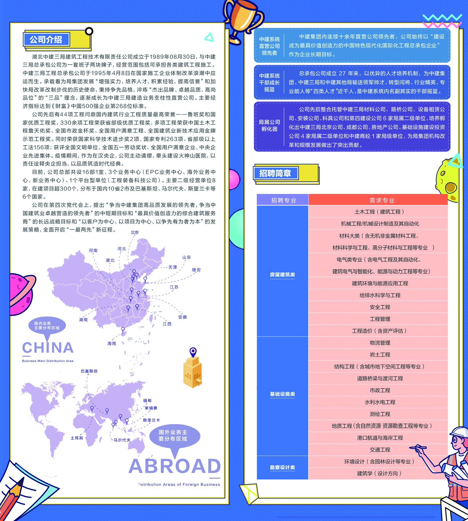 湖北中建三局建筑工程技術有限責任公司成立于1989年8月30日,與中建三局總承包公司為一套班子兩塊牌子,經營范圍涉及各類建筑工程施工。中建三局集團有限公司工程總承包公司是中建三局(集團)的支柱型直營公司(湖北中建三局建筑工程技術有限責任公司為中建三局總承包公司法人單位名稱,與中建三局總承包公司為一套班子兩塊牌子,簽約主體為湖北中建三局建筑工程技術有限責任公司,招錄人員完全由總承包公司自主管理),1995年4月8日成立,具有房屋建筑工程施工總承包特級資質。主要分布在湖北、河南、河北、山東、天津、湖南、海南、安徽、江西、江蘇、北京等區域,積極開拓斯里蘭卡、馬爾代夫、巴基斯坦、柬埔寨、緬甸、土耳其等多個國家和地區,涵蓋高端房建、基礎設施、機電安裝、高級裝飾、海外等業務版塊。公司主要經營單位8家:中原分公司、華北分公司、中南分公司、安裝分公司、科教文衛事業部、基礎設施分公司、海南(有限)、裝飾事業部;3個業務中心:EPC業務中心、海外業務中心、新業務中心;1個平臺型單位:工程裝備科技公司。公司先后有44項工程問鼎國內建筑行業工程質量最高榮譽——魯班獎和國家優質工程獎,330余項工程榮獲省部級優質工程獎,多項工程榮獲中國土木工程詹天佑獎、全國市政金杯獎、全國用戶滿意工程、全國建筑業新技術應用金牌師范工程獎。同時榮獲國家科學技術進步獎2項、國家專利263項、省部級以上工法156項;獲評全國文明單位、全國五一勞動獎狀、全國用戶滿意企業、中央企業先進集體。疫情期間,作為在漢央企,公司主動請纓,牽頭建設火神山醫院,以責任詮釋央企擔當,以品質筑造時代經典。
