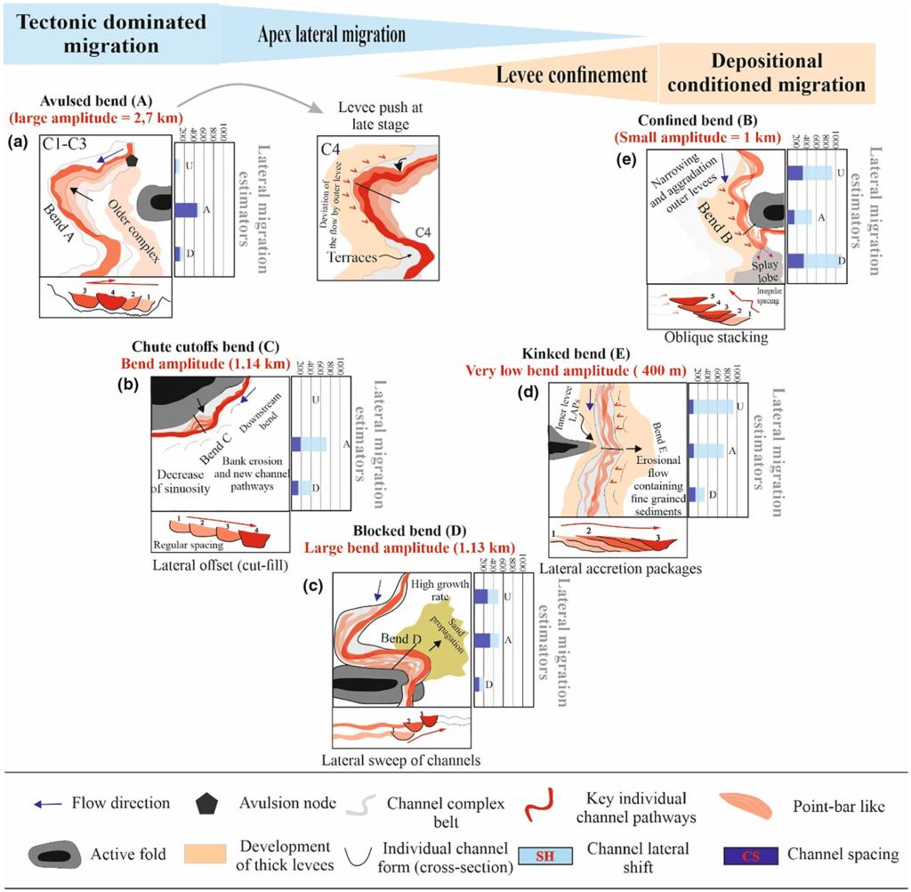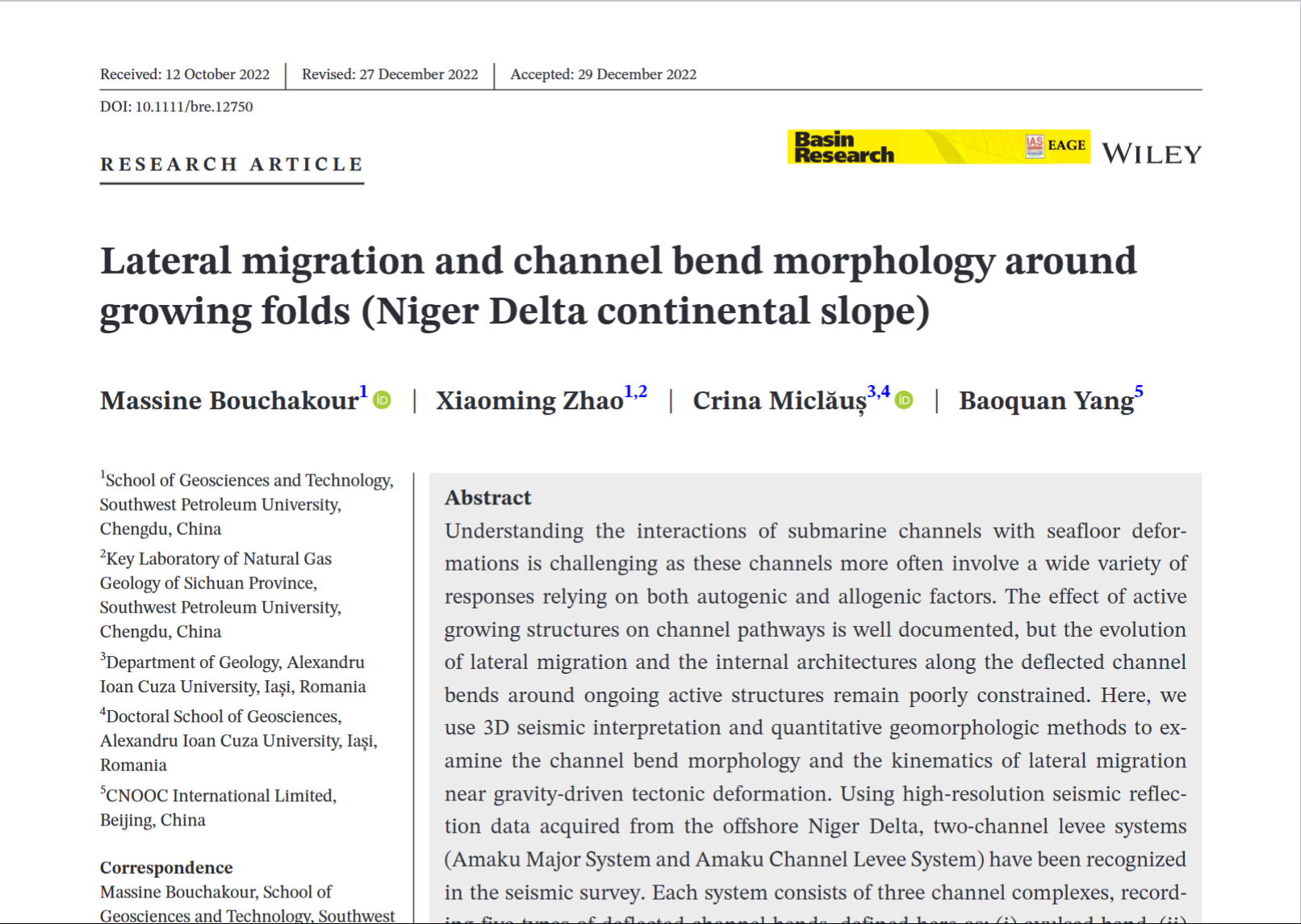 我院趙曉明教授領銜的深水沉積與油氣地質研究團隊近期在深海水道沉積構型與同生構造響及海底地貌響應特研究方面取得新的進展,成果以論文“Lateral migration and channel bend morphology around growing folds (Niger Delta continental slope)” 發表于國際地球科學著名頂級期刊《Basin Research》。該項研究由我院趙曉明教授團隊牽頭,聯合羅馬尼亞Alexandru Ioan Cuza大學、中海油國際公司共同完成,我院為論文第一作者單位,博士生Massine Bouchakour為論文第一作者。