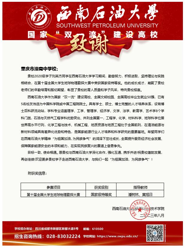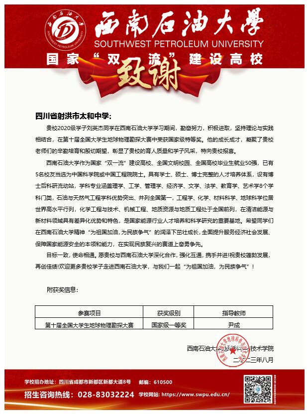 為不斷擴大西南石油大學以及地球科學與技術學院的知名度,進一步加強與優(yōu)質高中的交流合作,我院向新疆和川渝部分高中寄送喜報,旨在感謝中學多年來向我校輸送大量優(yōu)質生源,并持續(xù)推進大學——高中人才聯(lián)動培養(yǎng)、深化彼此合作聯(lián)系,將彼此友誼打造得更緊密、更牢靠。