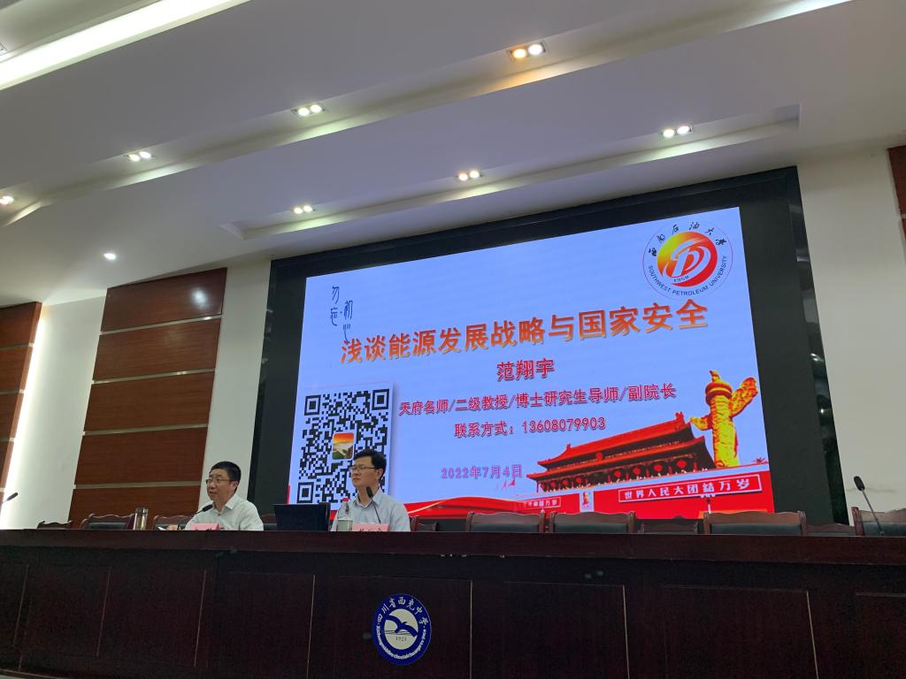 范翔宇教授為西充中學師生作了題為《淺談能源發展戰略與國家安全》的科普講座。范教授從“石油與我們的生活”、“石油的勘探與開采”、“石油人與石油精神”、“石油危機與國家安全”、“石油與新能源”、“我國石油人才與企業”等六大方面深入淺出地講述了當代資源與能源問題,鼓勵在座同學要厚植愛國情懷、心懷“國之大者”,將個人命運與國家命運緊密相連,不忘初心,爭取為我國能源事業貢獻力量。
