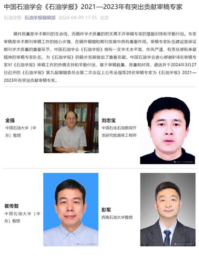 沉積地質教研室彭軍教授榮獲《石油學報》“2021-2023年有突出貢獻審稿專家”榮譽稱... 近日,中國石油學會從《石油學報》的818名審稿專家中綜合審稿數量、質量和時效等指標遴選了20名有突出貢獻的審稿專家,授予《石油學報》“2021-2023年有突出貢獻審稿專家”榮譽稱號。我院沉積地質教研室彭軍教授...[詳細] 2024-04-11