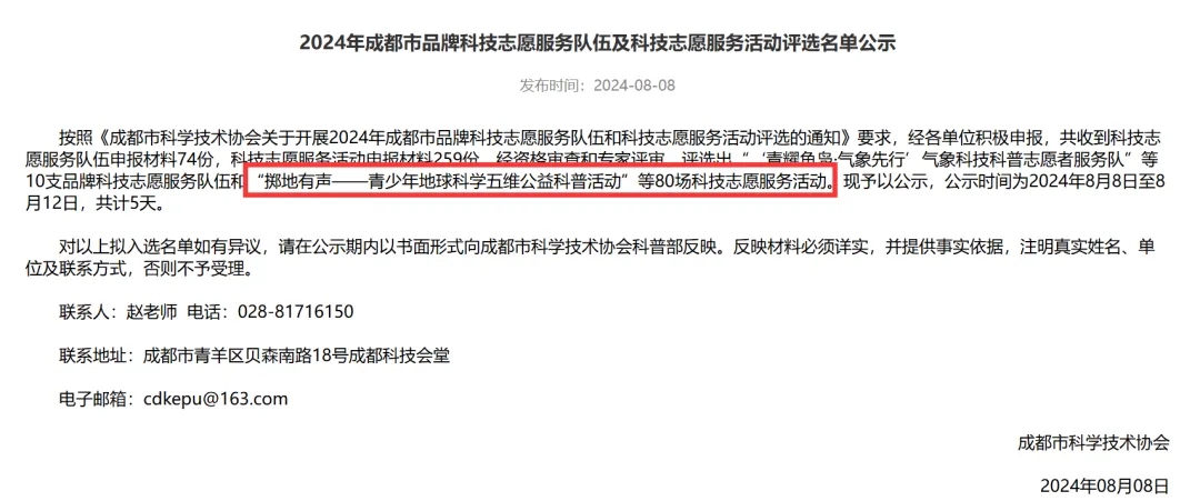 近日,按照《成都市科學技術協會關于開展2024年成都市品牌科技志愿服務隊伍和科技志愿服務活動評選的通知》要求,經成都市各單位積極申報,共收到科技志愿服務隊伍申報材料74份,科技志愿服務活動申報材料259份。...[詳細]