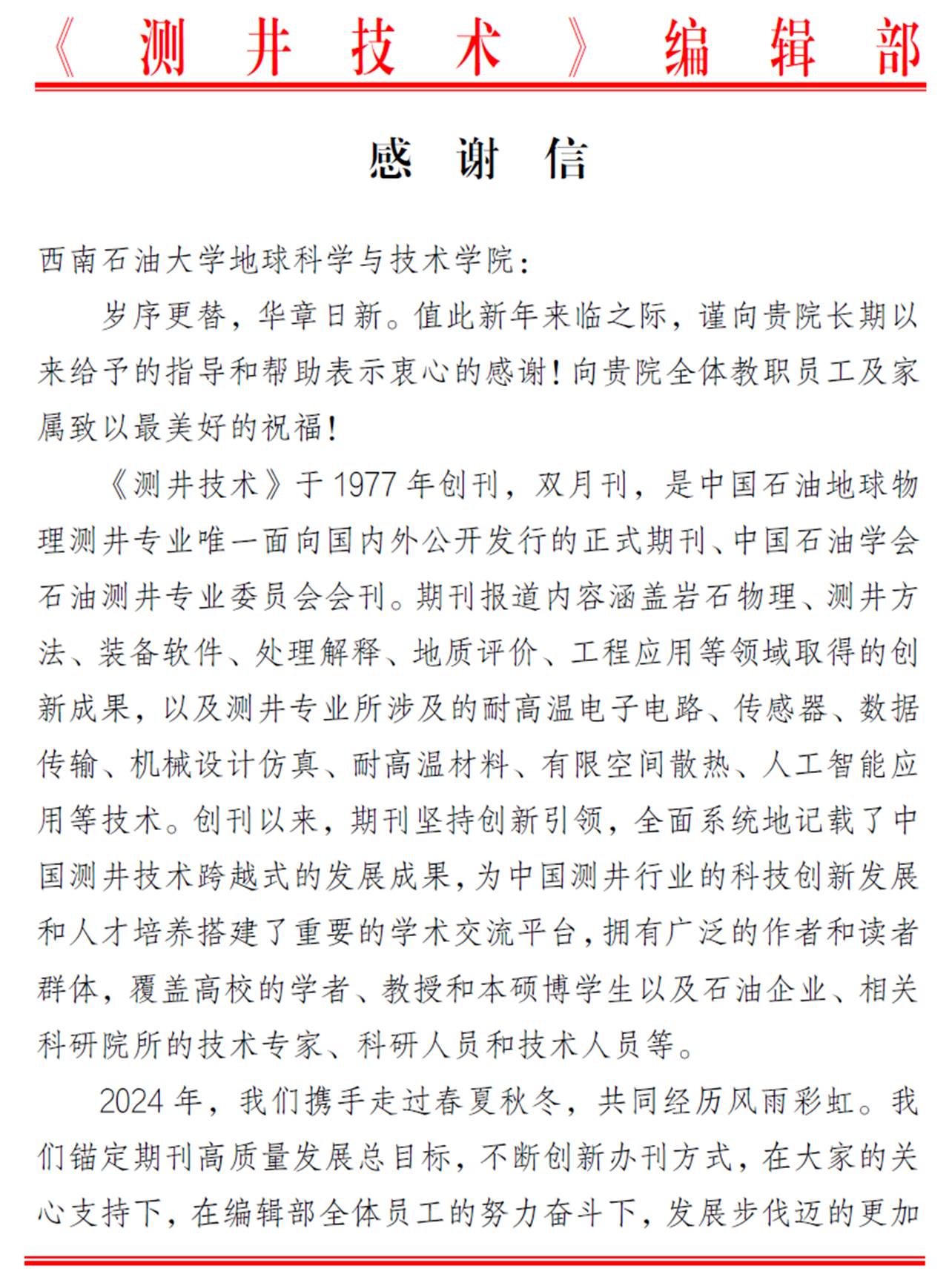 近日,學院收到《測井技術》期刊編輯部發來的感謝信,信中對我院領導、師生長期以來對期刊發展的全力支持表示感謝,并期望進一步加大合作,共建測井行業高質量的學術成果交流和人才培養平臺,為推動中國測井行業...[詳細]