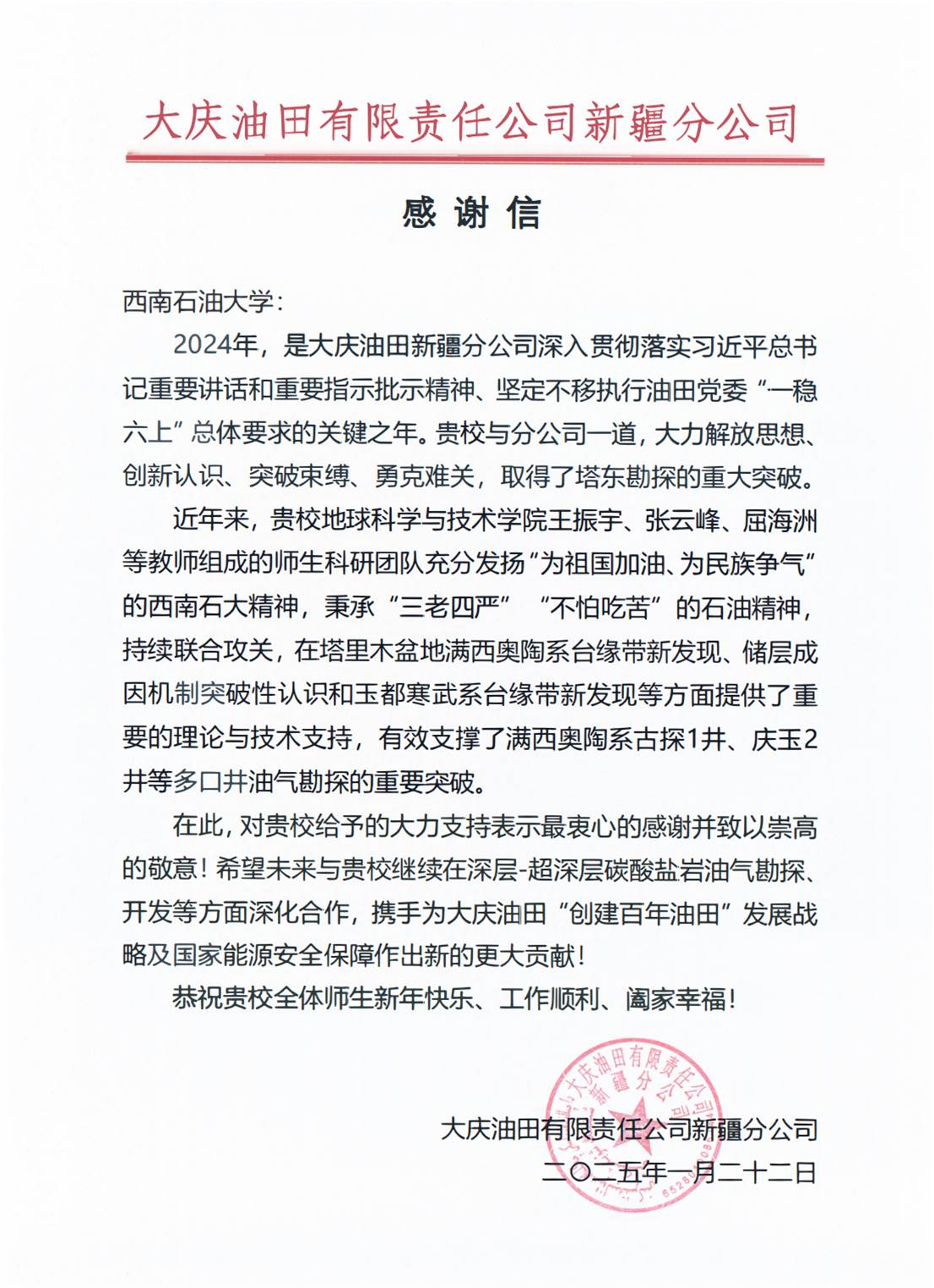 近日,學校收到大慶油田有限責任公司新疆分公司的感謝信,信中對我院師生團隊在塔里木盆地滿西奧陶系臺緣帶及玉都寒武系臺緣帶新發現等提供的理論與技術支持給予高度肯定及感謝。信中提到,近年來,西南石油大學...[詳細]
