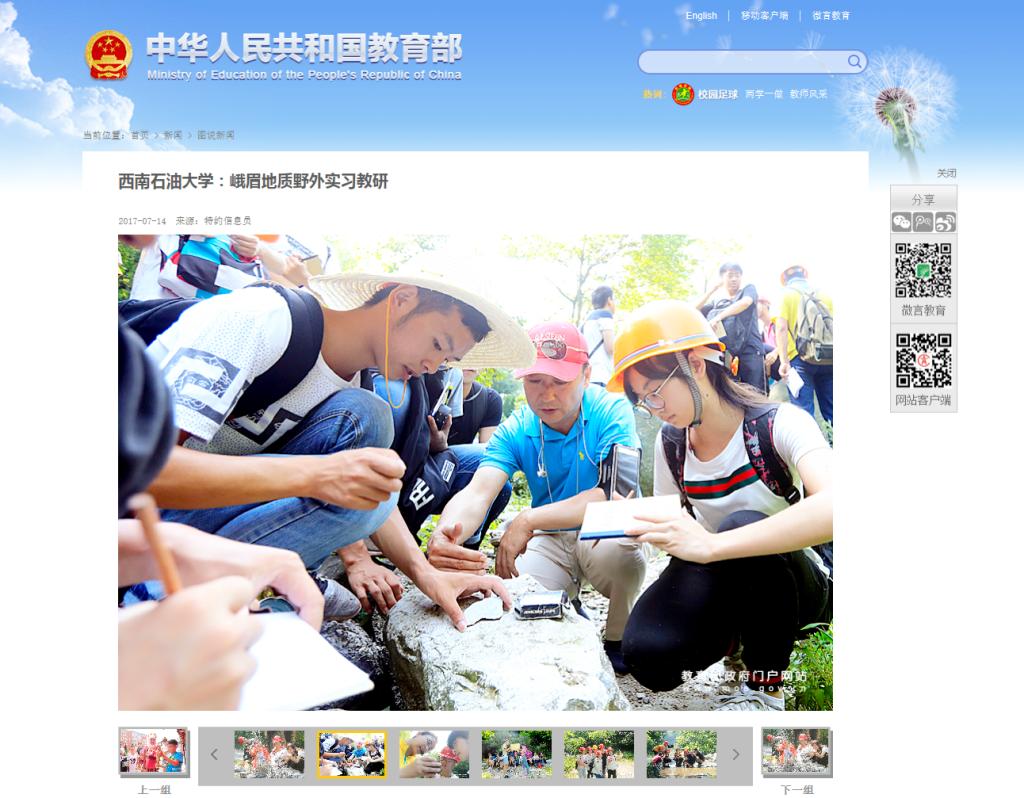 7月14日,教育部官網(wǎng)在顯著位置,用大圖的形式,以《西南石油大學(xué):峨眉地質(zhì)野外實習(xí)教研》為題,對我校地科院在峨眉山開展的野外地質(zhì)實習(xí)進(jìn)行了報道。報道說,西南石油大學(xué)資源勘查工程2016級和地質(zhì)學(xué)2016級專業(yè)...[詳細(xì)]