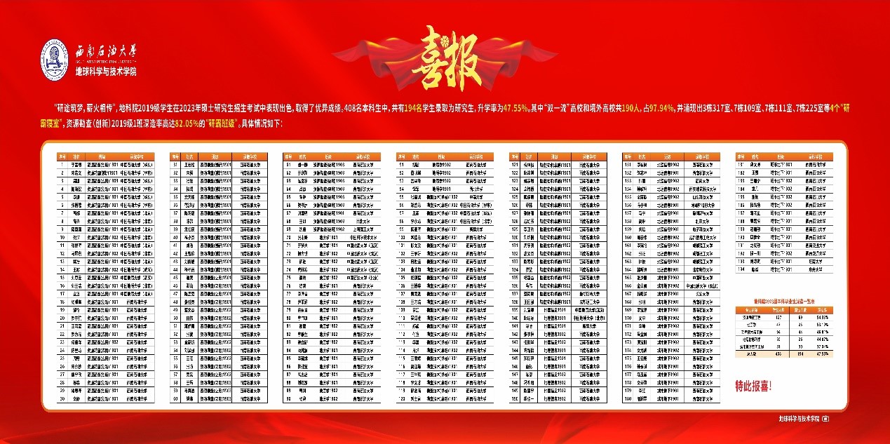 星光不負(fù)趕路人,碩果飄香又一年。2023年全國碩士研究生招生錄取工作落下帷幕。地科院2019級409名本科畢業(yè)生中,有195名學(xué)生被錄取為研究生,升學(xué)率達(dá)47.68%,其中“雙一流”高校和境外高校共191人,占97.95%,實(shí)...[詳細(xì)]