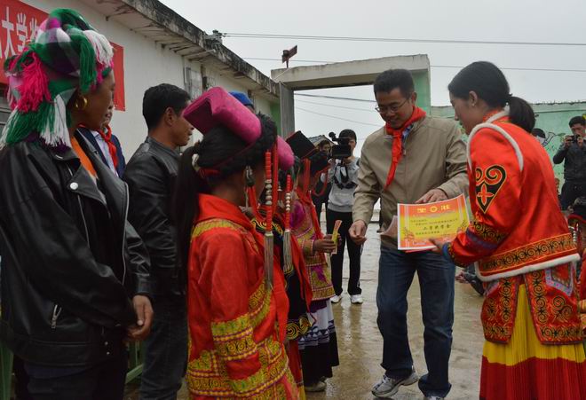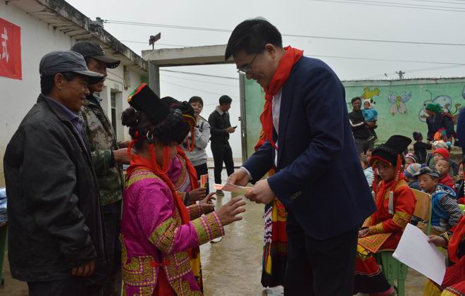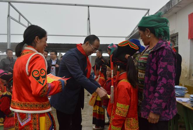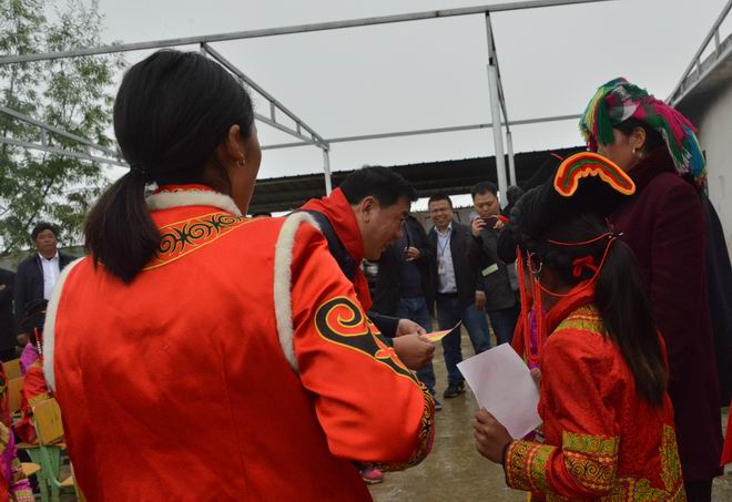 翻過一道陡坡,趙金洲等又來到新寨子村小學(xué)。小學(xué)高年級(jí)學(xué)生已轉(zhuǎn)到鎮(zhèn)中心學(xué)校就讀,只剩下一年級(jí)、三年級(jí)兩個(gè)班,附帶一個(gè)幼兒班,全部學(xué)生40多人,教師4人。雖為袖珍小學(xué),但經(jīng)我校兩年的幫扶,設(shè)施設(shè)備一應(yīng)齊全。師生家長(zhǎng)早已齊聚操場(chǎng),參加2018-2019年度“西南石油大學(xué)獎(jiǎng)學(xué)金”發(fā)放儀式。孩子們身著民族服裝,好比參加一場(chǎng)盛大的節(jié)日。他們給領(lǐng)導(dǎo)們佩帶了紅領(lǐng)巾,在唱國(guó)歌、升國(guó)旗儀式之后,領(lǐng)導(dǎo)們給獲獎(jiǎng)學(xué)生發(fā)放了獎(jiǎng)學(xué)金,給小學(xué)生每人發(fā)放一套校服,給教師發(fā)放了教師津貼。趙金洲勉勵(lì)孩子們好好學(xué)習(xí),走出大山看看,并表示,今年暑假將邀請(qǐng)孩子們到成都、到西南石油大學(xué)參觀學(xué)習(xí)。