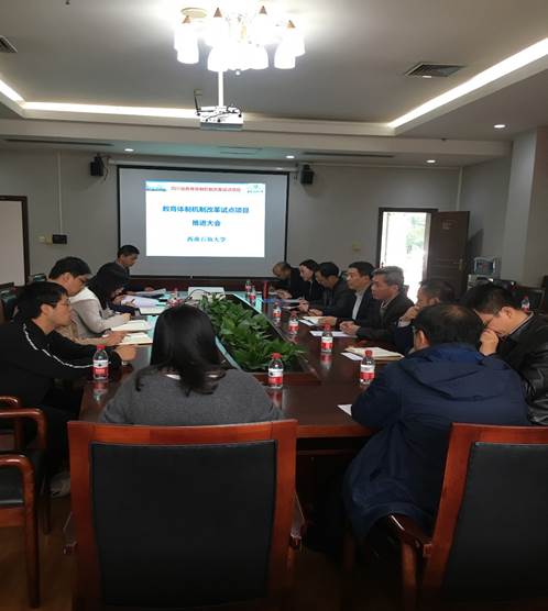 張明泉處長(zhǎng)指出學(xué)校高度重視改革試點(diǎn)工作,為保證學(xué)校承擔(dān)的改革試點(diǎn)項(xiàng)目順利實(shí)施,制定了《西南石油大學(xué)關(guān)于四川省教育綜合改革試點(diǎn)項(xiàng)目的管理辦法》,成立了改革試點(diǎn)領(lǐng)導(dǎo)小組和領(lǐng)導(dǎo)小組辦公室。為保障改革試點(diǎn)工作順利開(kāi)展,學(xué)校將試點(diǎn)項(xiàng)目按照省級(jí)項(xiàng)目立項(xiàng),并列入學(xué)校啊年度科研計(jì)劃管理,并為每項(xiàng)改革試點(diǎn)提供了3萬(wàn)元的啟動(dòng)經(jīng)費(fèi)。各試點(diǎn)項(xiàng)目組成了由校領(lǐng)導(dǎo)擔(dān)任負(fù)責(zé)人,以相關(guān)職能部門(mén)干部和優(yōu)秀教師為主的研究試點(diǎn)工作組。制定了監(jiān)督評(píng)估管理辦法,建立了監(jiān)督評(píng)估機(jī)制和風(fēng)險(xiǎn)預(yù)警機(jī)制,實(shí)現(xiàn)改革試點(diǎn)工作的全過(guò)程監(jiān)督。會(huì)上張?zhí)庨L(zhǎng)還通報(bào)了7、8月教育綜合改革試點(diǎn)項(xiàng)目實(shí)施的進(jìn)展情況和改革試點(diǎn)動(dòng)態(tài)報(bào)送情況,并要求各項(xiàng)目工作組準(zhǔn)備好項(xiàng)目評(píng)估和年度總結(jié)工作。