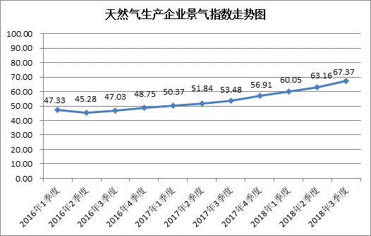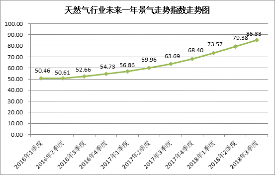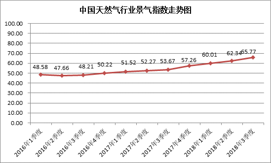 中國天然氣行業景氣指數統計結果顯示:2018年3季度中國天然氣行業景氣指數為65.77,處于較景氣狀態;天然氣生產企業景氣指數為67.37,處于較景氣狀態;天然氣銷售公司景氣指數為65.29,處于較景氣狀態;天然氣行業未來一年景氣走勢指數為85.33,天然氣行業未來一年可能進入很景氣狀態。