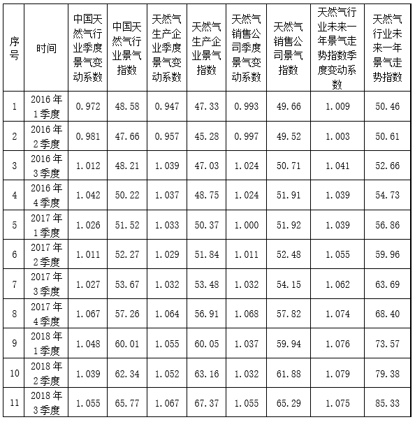 天然氣行業景氣指數統計表