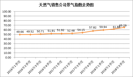 2018 年 3季度天然氣銷售公司景氣指數為65.29,處于較景氣狀態,與2018年2季度相比有較大幅度上升,季節景氣變動系數為 1.055。其中,產品銷量、供求關系、價格水平較上季度有大幅度上升,經營狀況則出現較大幅度上升,就業人員出現一定幅度上升而員工收入保持基本不變。
