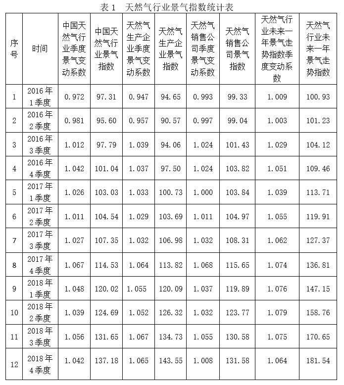 表1 天然氣行業景氣指數統計表