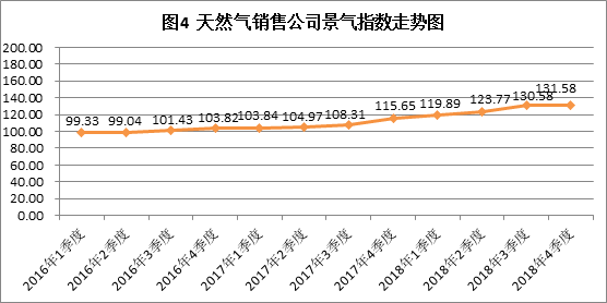 2018 年 4季度天然氣銷售公司景氣指數為131.58,處于較景氣狀態。本季度與2018年3季度相比基本保持穩定,季節景氣變動系數為 1.008。其中,經營狀況出現較大幅度上升,產品銷量、就業人員基本保持不變,員工收入、價格水平出現一定幅度下降。詳見圖4及表1。