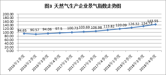 2018 年 4季度國內天然氣生產企業運營狀況有所改善,天然氣生產企業景氣指數為 143.55,處于較景氣狀態。本季度與2018年3季度相比有較大幅度上升,季節景氣變動系數為 1.065。其中投資水平、產能變化、產能利用、企業產量、經營狀況較上季度均有大幅度上升,員工收入較上季度有一定幅度上升,價格在本季度保持不變,但就業人員在本季度有一定幅度下降。詳見圖3及表1。