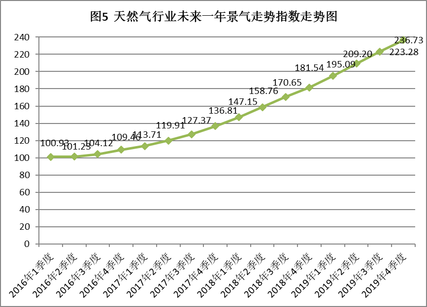 2019年4季度統(tǒng)計(jì)的天然氣行業(yè)未來(lái)一年景氣走勢(shì)指數(shù)為236.73 ,預(yù)計(jì)未來(lái)一年天然氣行業(yè)處于很景氣狀態(tài)。本季度與2019年3季度的預(yù)測(cè)值223.28 相比,有大幅度上升,其季度變動(dòng)系數(shù)為 1.060 。其中,天然氣行業(yè)專家、天然氣生產(chǎn)企業(yè)相關(guān)專家、天然氣銷售公司相關(guān)專家對(duì)天然氣行業(yè)未來(lái)一年景氣走勢(shì)判斷,均持樂(lè)觀態(tài)度。詳見(jiàn)圖5及表1。