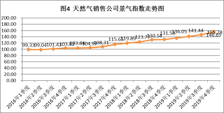 2019年4季度天然氣銷售公司景氣指數(shù)為155.28 ,處于較景氣狀態(tài)。本季度較2019年3季度相比有一定幅度上升,季節(jié)景氣變動(dòng)系數(shù)為1.0590 。其中就業(yè)人員出現(xiàn)小幅度下降,員工收入、供求狀態(tài)及經(jīng)營(yíng)狀況有小幅度上升,價(jià)格水平和產(chǎn)品銷量出現(xiàn)較大幅度上升。詳見(jiàn)圖4及表1。