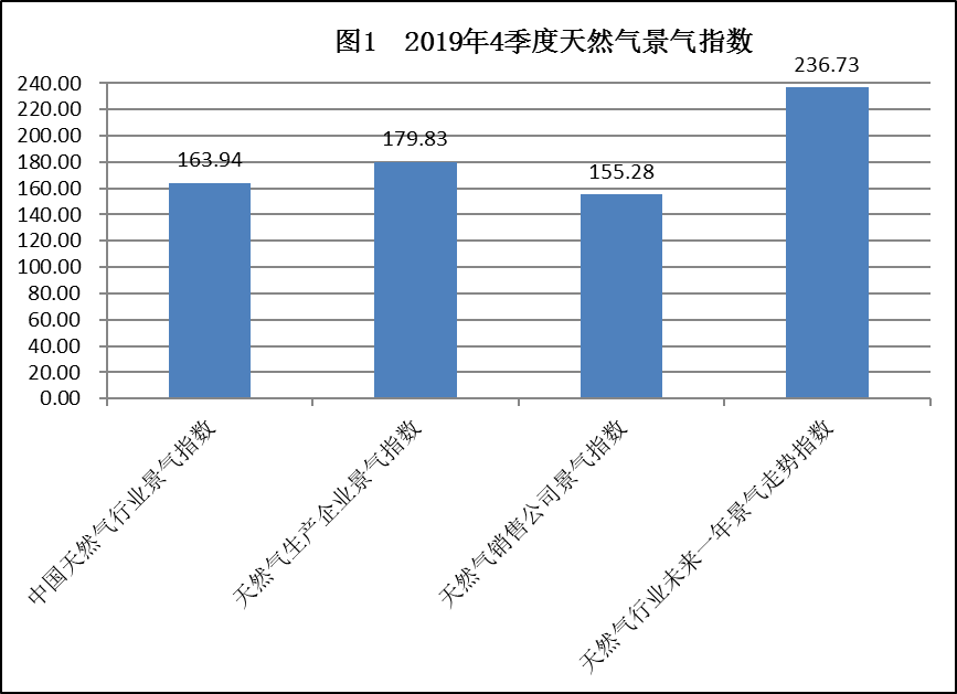 中國(guó)天然氣行業(yè)景氣指數(shù)統(tǒng)計(jì)結(jié)果顯示:2019年4季度中國(guó)天然氣行業(yè)景氣指數(shù)為163.94 ,處于景氣狀態(tài);天然氣生產(chǎn)企業(yè)景氣指數(shù)為179.83 ,處于景氣狀態(tài);天然氣銷售公司景氣指數(shù)為155.28 ,處于較景氣狀態(tài);天然氣行業(yè)未來(lái)一年景氣走勢(shì)指數(shù)為236.73 ,處于很景氣狀態(tài)。詳見(jiàn)圖1及表1。