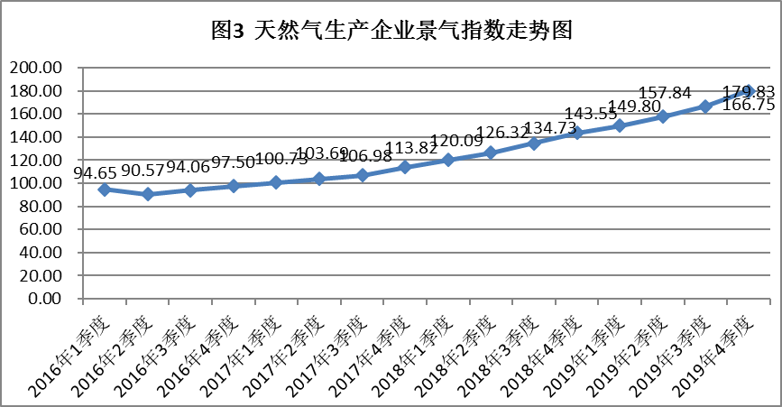 2019年4季度國(guó)內(nèi)天然氣生產(chǎn)企業(yè)運(yùn)營(yíng)狀況有所改善,天然氣生產(chǎn)企業(yè)景氣指數(shù)為 179.83 ,處于景氣狀態(tài)。本季度與2019年3季度相比有一定幅度上升,季節(jié)景氣變動(dòng)系數(shù)為1.078 。其中價(jià)格水平基本保持不變,投資水平和就業(yè)人員較上季度有一定幅度上升,產(chǎn)能利用、員工收入、產(chǎn)能變化、經(jīng)營(yíng)狀況和企業(yè)產(chǎn)量較上季度有大幅度上升。詳見(jiàn)圖3及表1。